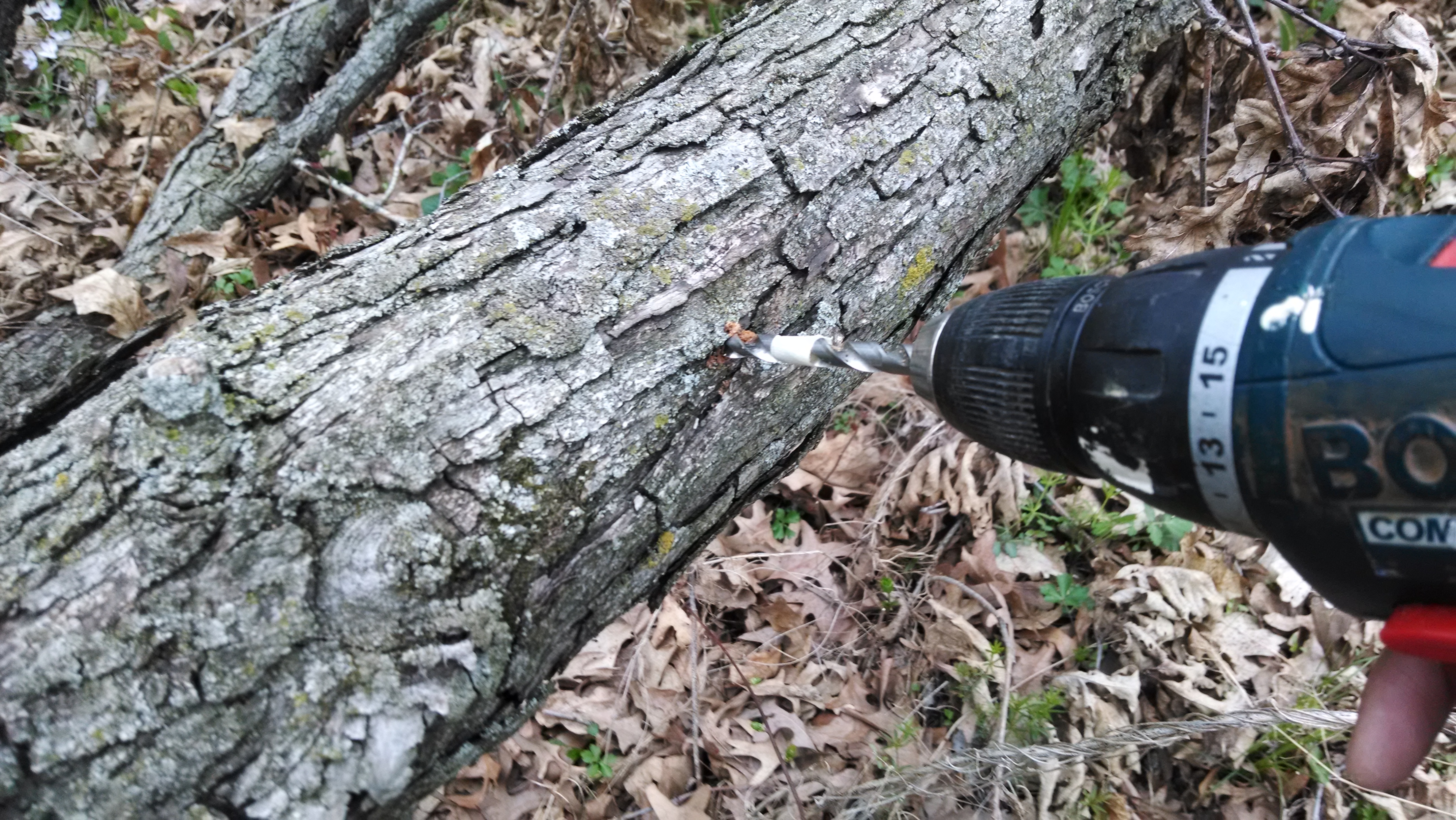 Drilling the holes in the oak limb, a casualty of a recent wind storm