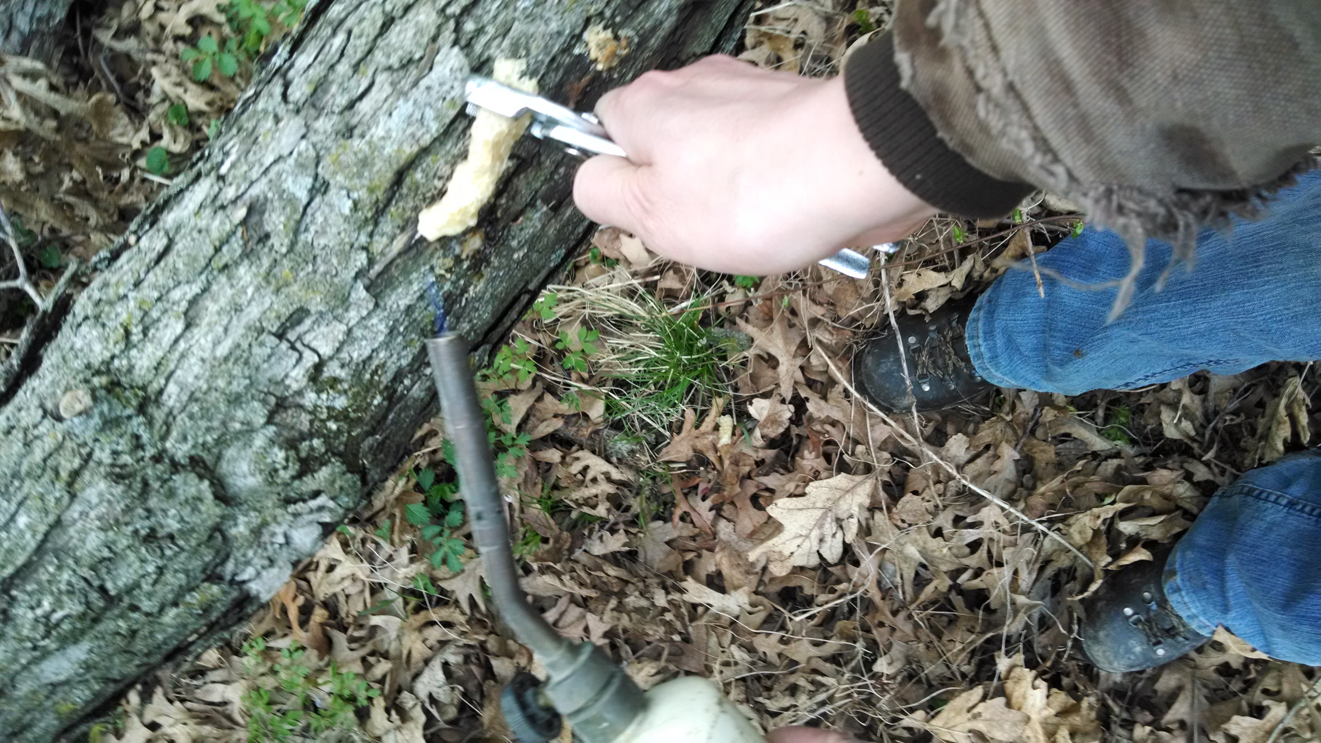 Sealing the plug into the tree with a bit of melted beeswax. There are definitely more efficient means of melting beeswax than a torch (the directions recommend melting the wax in a pot, and painting it on the plug). Now, we wait!