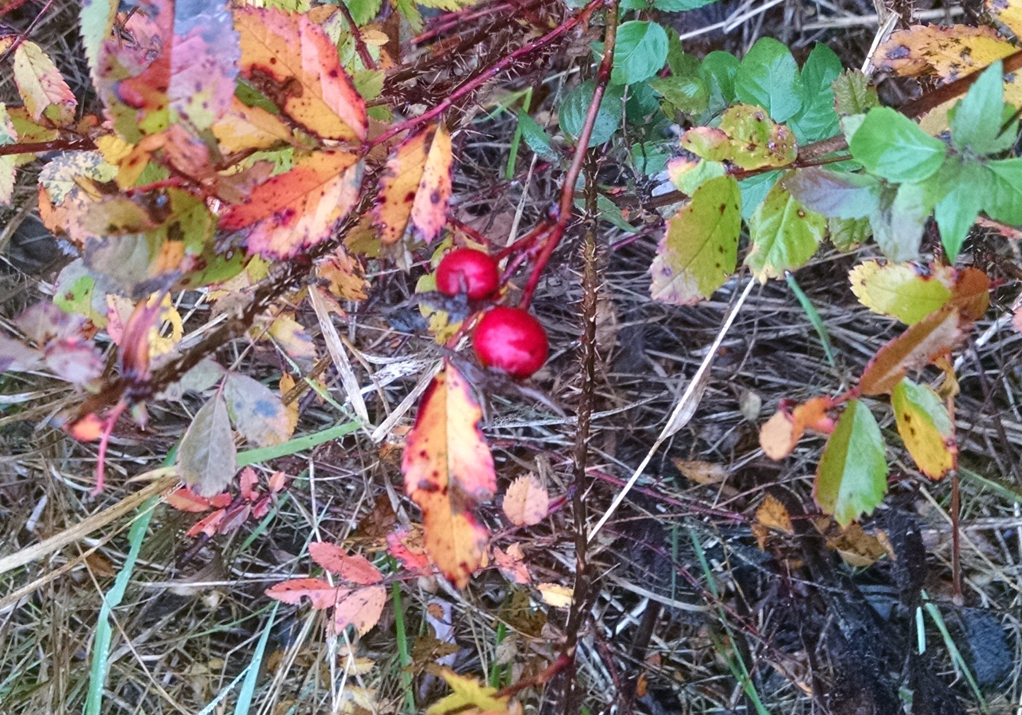 White oak leaves after a rainstorm.Sugar maple leaves. Both the oaks and the maples produce golden leaves as well this time of year.Sumac leaves, on the other hand, only turn red before falling off.The red I was most excited about discovering on my last walk was a lovely patch of rose hips. Not only are the hips edible, I was able to cut them in half and save the seeds for future plantings, while drying the rose hips for turning into tea.