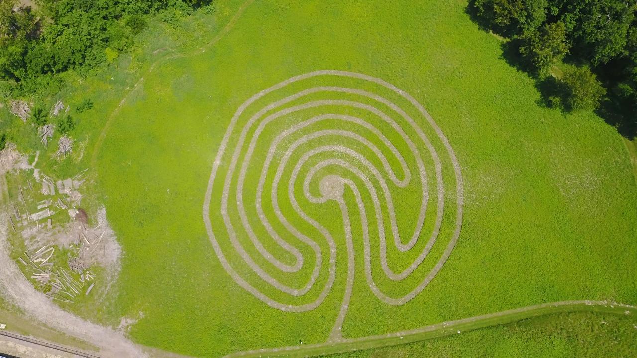 The best place to be, in relationship to a labyrinth, is inside the labyrinth. The second best place to be is 400 feet above. While the labyrinth at Indian Creek Nature Center still has a few rough spots and won’t be officially open until September, the first mowing of the path has revealed the beauty of the design.